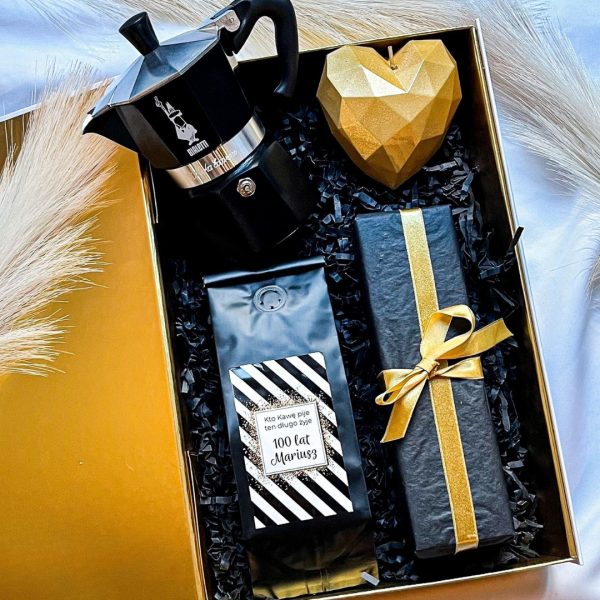 ZEESTAW URODZINOWY Z KAWIARKĄ, LISTKAMI WAFLOWYMI I ŚWIECZKĄ